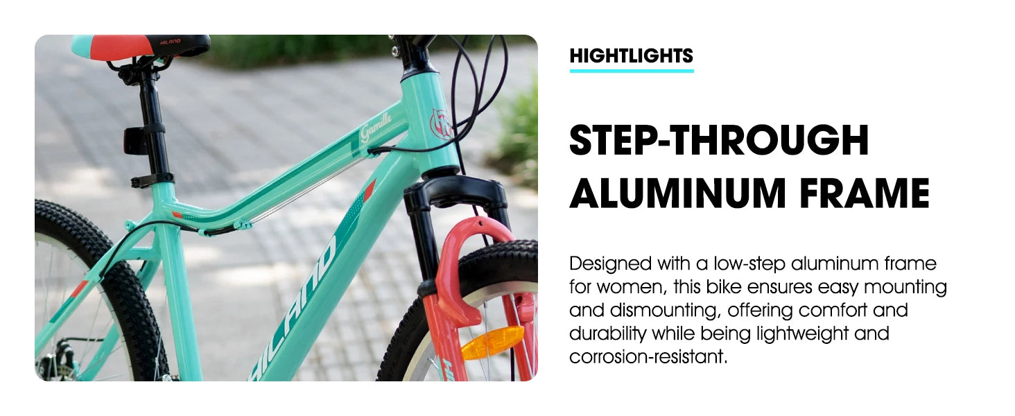 High Tech Frame: GAMILLE 300 has a durable, ultralight and durable aluminium frame that is perfect for exploring mountain trails in safety and comfort; This low standover height design allows shorter riders and women to straddle their bike more easily