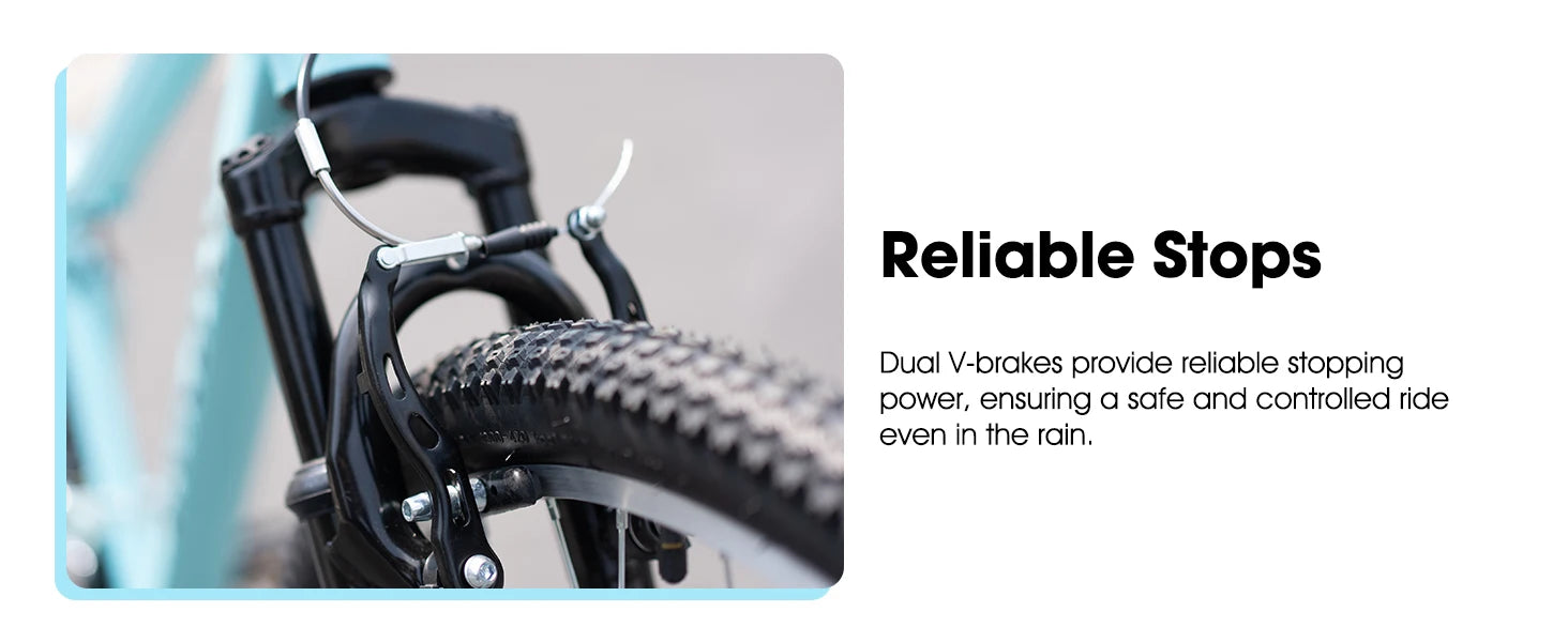 Dependable V-Brake System: Traditional v-brakes deliver reliable stopping power, making them easy to maintain and adjust, ideal for beginners learning the fundamentals of brake control in outdoor environments