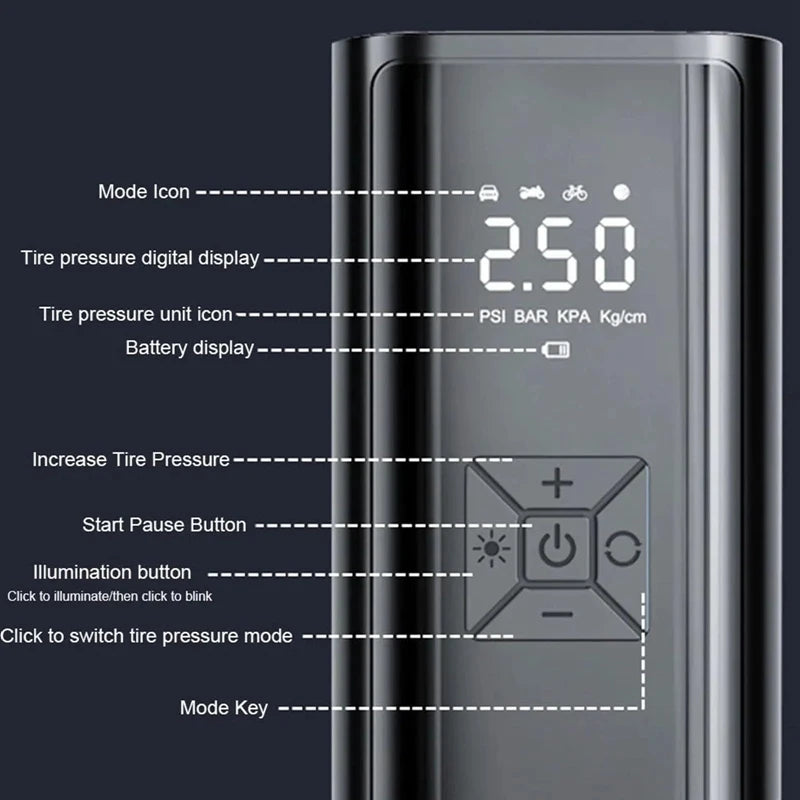 4. Full screen digital display: The display screen of the inflation pump can display information such as pressure and power, making it convenient for users to understand the working status of the inflation pump.